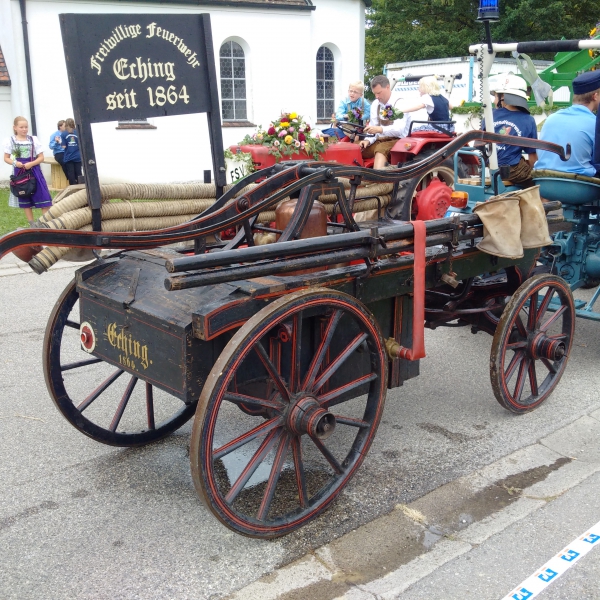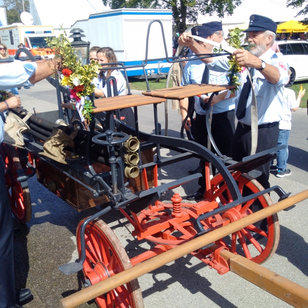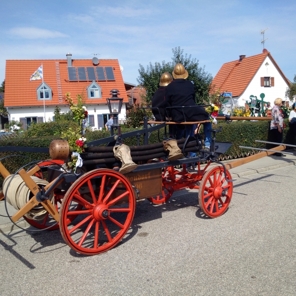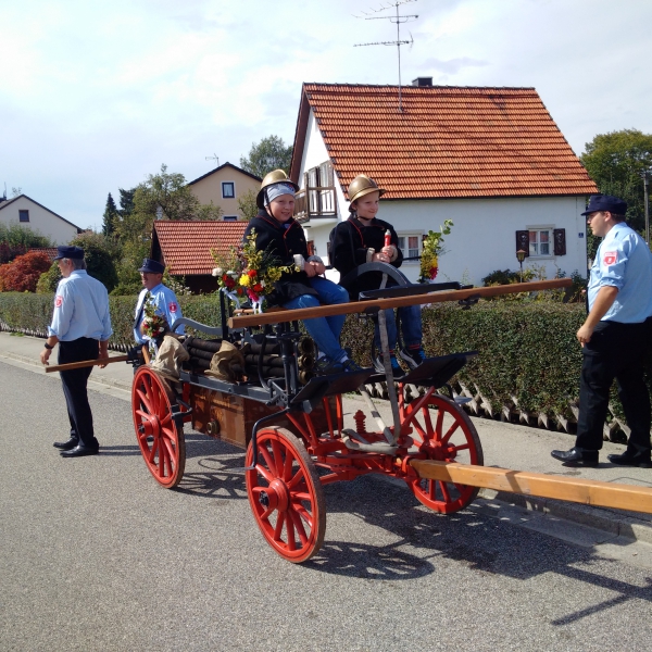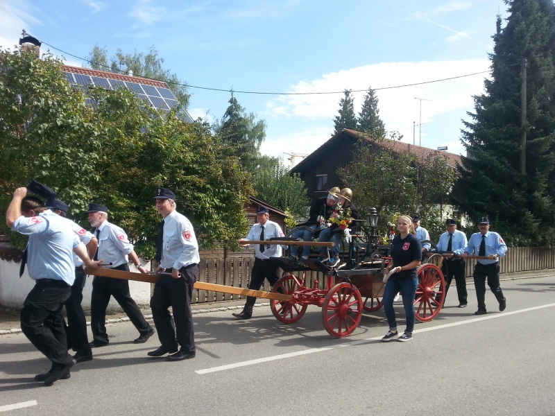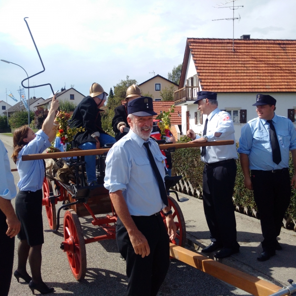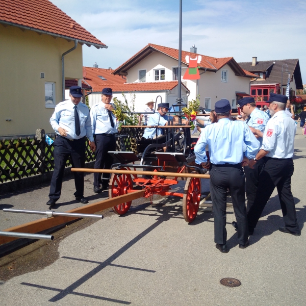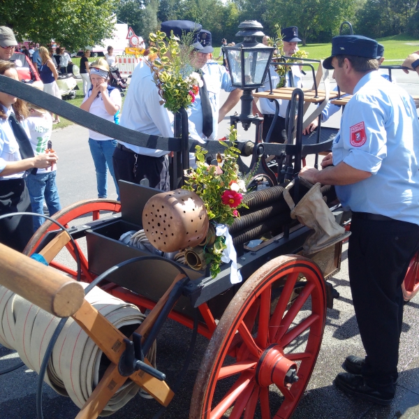 Mittags wurde der Spritzenwagen geholt und zum Festplatz verbracht. Das historische Fahrzeug von 1896 wurde geschmückt und der Tank wurde mit Wasser gefüllt.