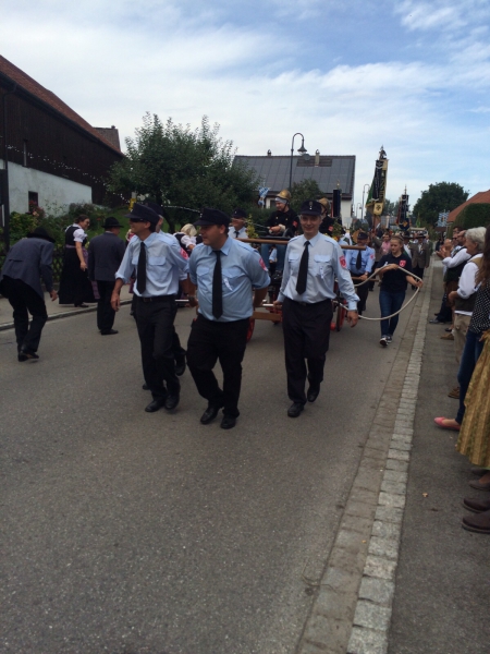 Um 14 Uhr begann bei schönstem Wetter der große Umzug durchs Dorf. Dabei bauten Fahrzeugbegleiter Druck auf und die jungen Begleiter spritzten kleine Mengen Wasser in die Zuschauermenge. Somit durften einige Zuschauer Kontakt mit dem kühlen Nass aufnehmen, was Jung und Alt sichtbar Freude bereitete.