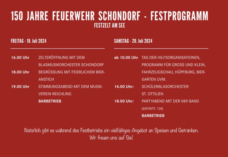 Tische für den 19.07. können kostenlos über eine Email an vorstand@feuerwehr-schondorf.de reserviert werden. Karten für den 20.07. gibt es an der Abendkasse.