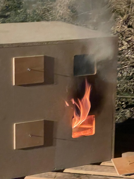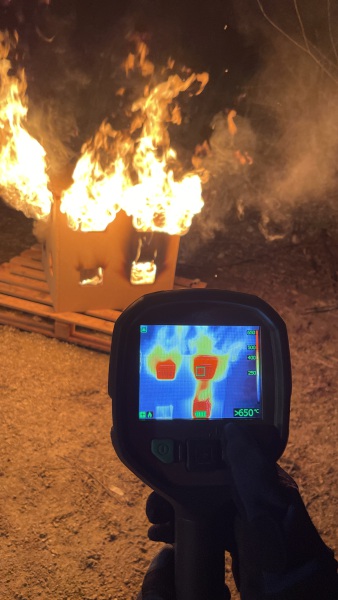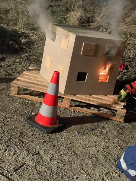 Sobald die Brände gelöscht waren, vermittelten die Ausbilder anhand eines kleinen Brandhäuschens, wie sich Rauch bei einem Brand in einem Haus verhält und ausbreitet und wie ein backdraft (Rauchgasdurchzündung) entsteht.